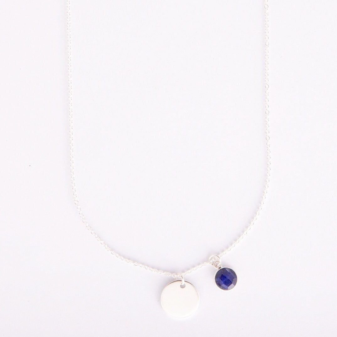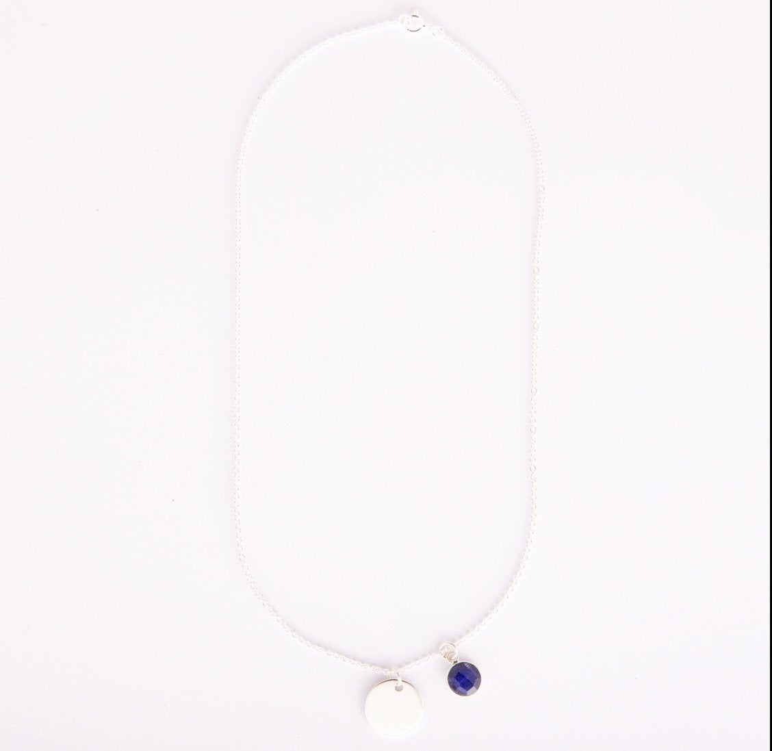 Silver disc and sapphire charm.