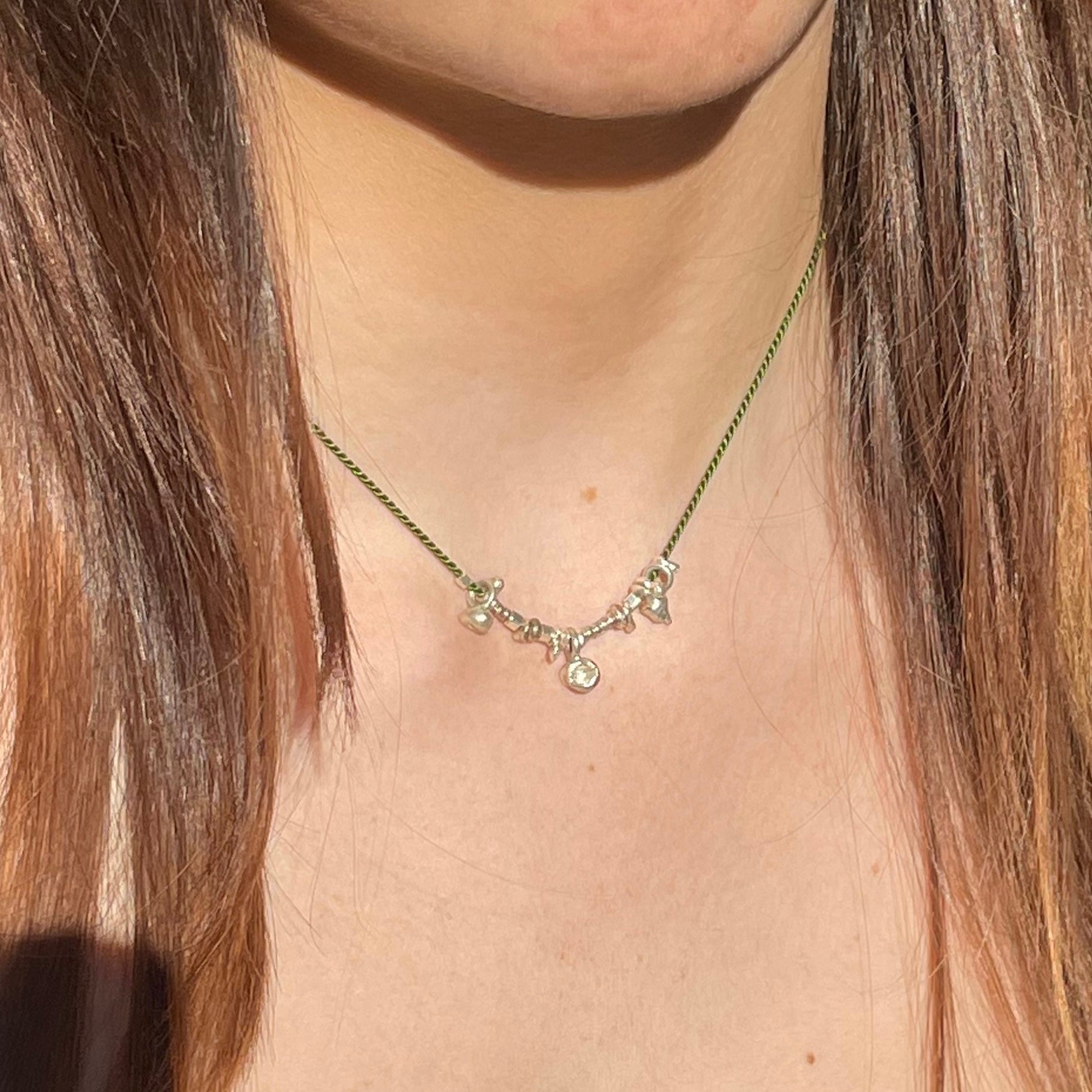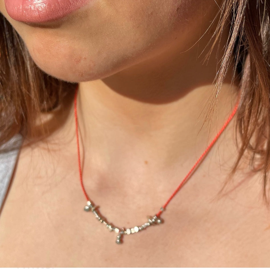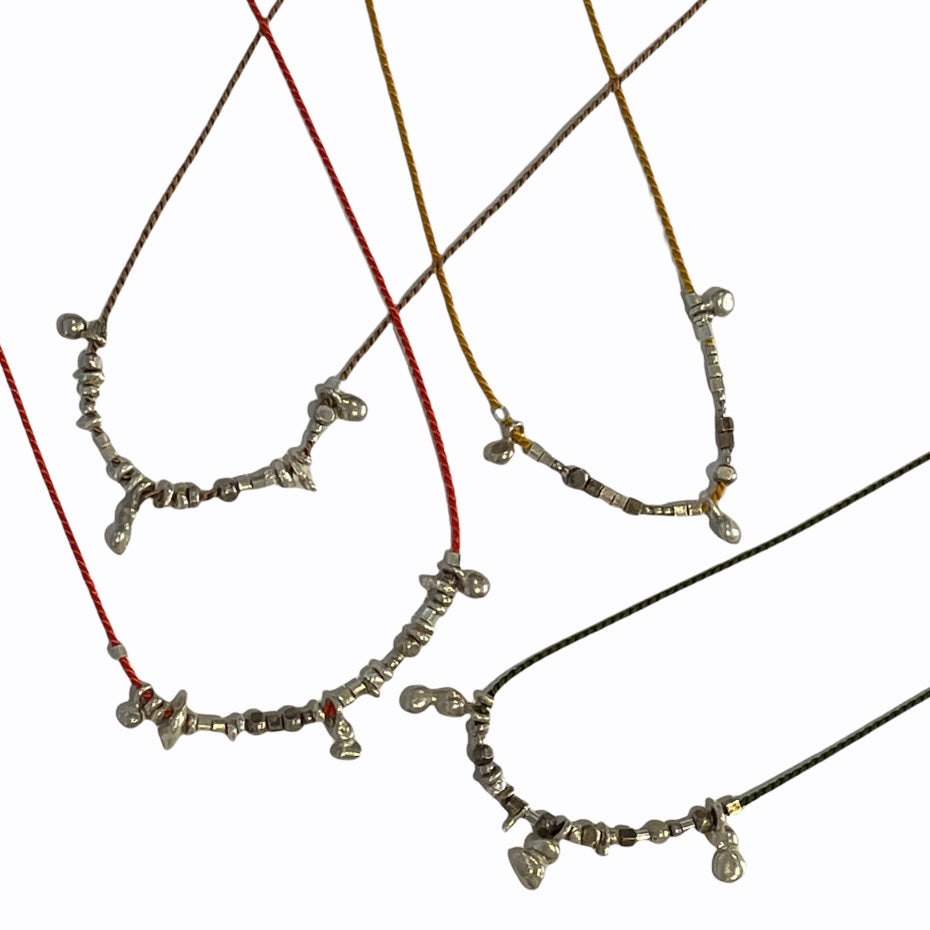 A selection of organically shaped silver beads sit in the centre of this fine silk string necklace.