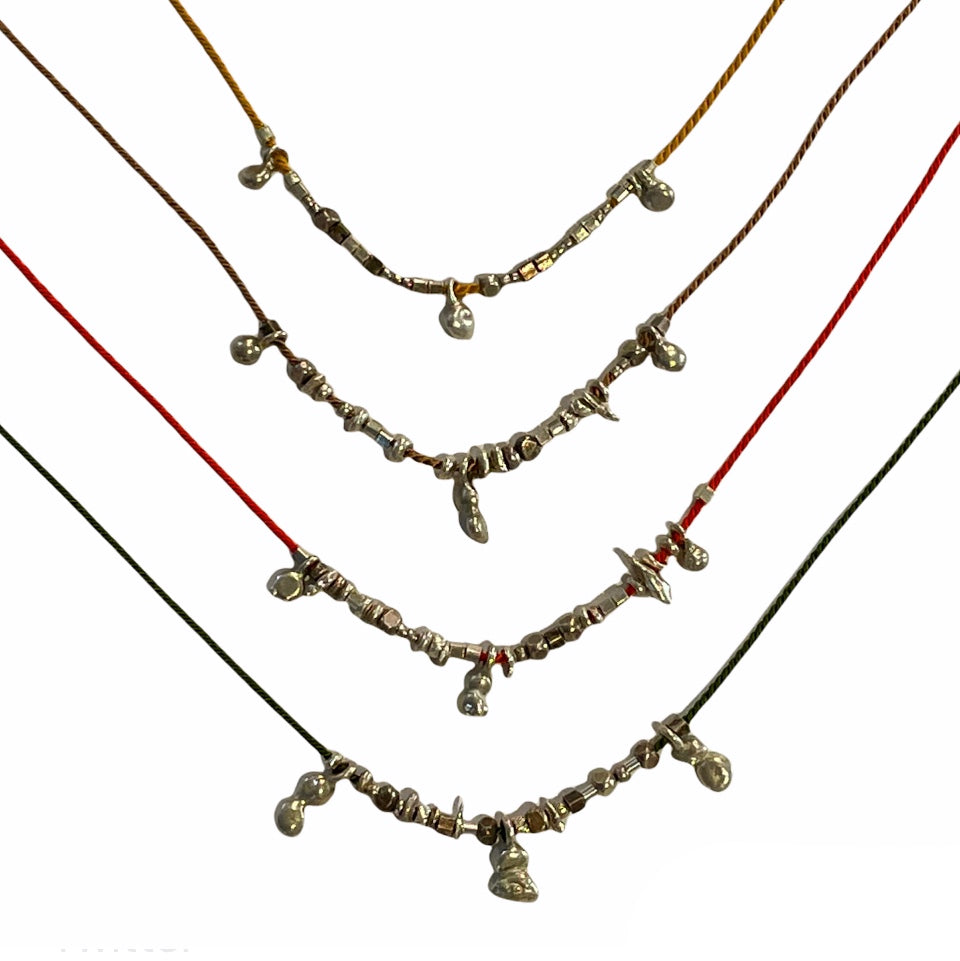 Beautiful silk thread necklaces in 4 colours, with sterling silver beads, on 44cm cord.