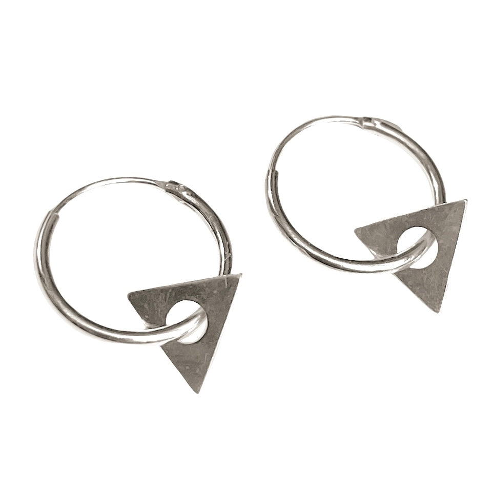 A delicate triangle hanging from a small sterling silver hoop.